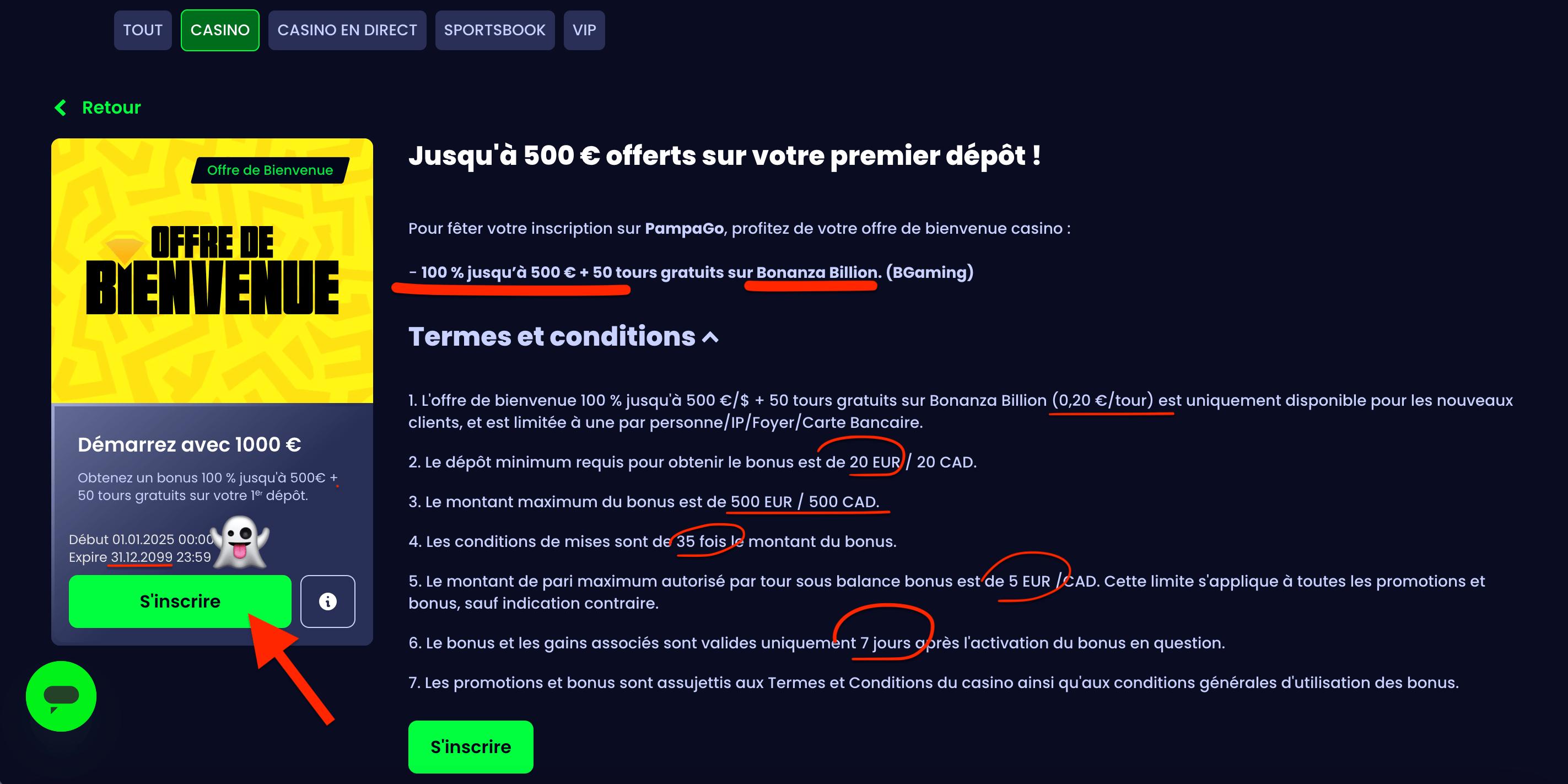 Quand tu t'inscris, PampaGo t'offre un bonus de 100% jusqu'à 1000€ plus 50 tours gratuits sur Bonanza Billion. Pas mal du tout ! Ça m'a permis de commencer direct avec un bankroll confortable.